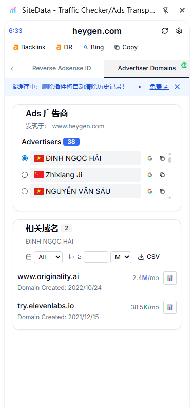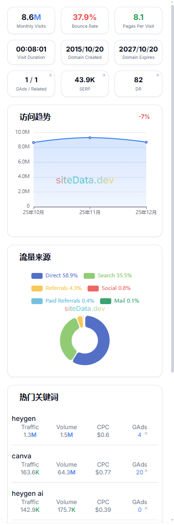 通过 heygen.com 的案例可以看到,SiteData 不仅提供访问量和来源,还能揭示广告主和地域分布,让你发现流量与商业化之间的联系。如果你正在研究某条赛道、评估一个站点或策划广告投放,SiteData 能让你更快看到本质;如果你只是想找个漂亮的流量面板,可能这款工具就不适合你了。