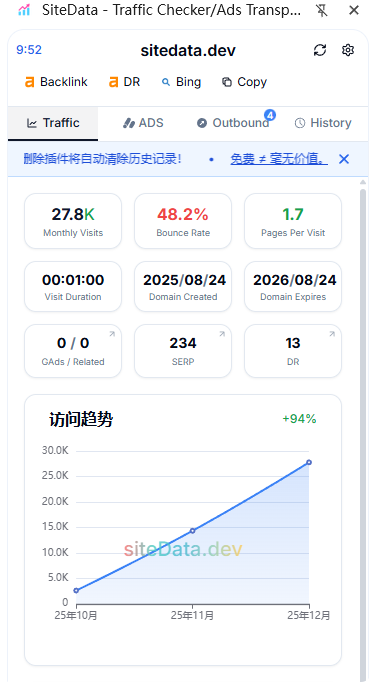 一句话概括:SiteData 是一款围绕“流量 × 广告 × 域名 × 关键词”的洞察工具。它不仅能让你查看某个网站的访问走势和关键字排名,还能反查 Google AdSense 账号背后的站点群,分析 Google Ads 广告主的投放行为,并快速获取域名历史和 DR 评分。这是一款为懂商业的人准备的工具,而不是华丽但无用的面板。