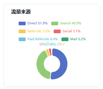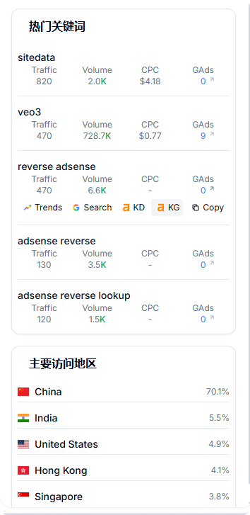 SiteData 会拆分搜索、社交、外链和直接访问等来源,直观呈现哪个渠道贡献了多少流量。结合热门国家/地区分布(Top Regions),你能迅速判断目标网站的主要市场。