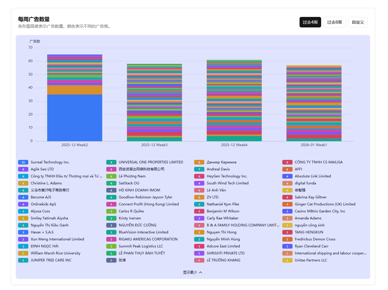 Surreal Technology Inc. 是最大的广告主,共投放 35 条广告,远超其他公司。其广告份额占据了 Week2 大部分蓝色区域,显示其在该网站投入力度大。