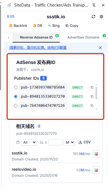 检查 AdSense ID 和关联站群:如果站点有投放 AdSense,记下 Publisher ID 并通过反查功能找出所有关联站点,判断该账号背后的盈利模式。