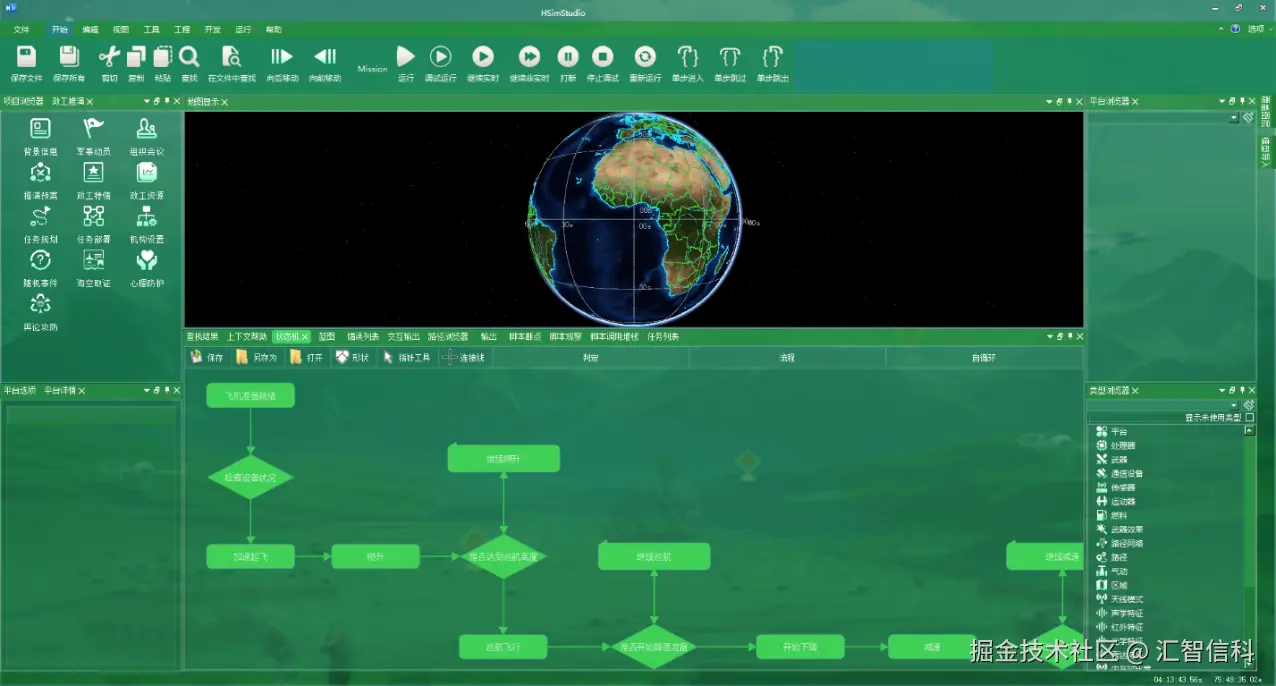 针对不同行业的仿真痛点,HSim 支持连续系统、离散系统、连续离散混合系统的一体化建模,兼容状态机、行为树、WBS、蓝图、Agent 等多种建模方法。无论是复杂的杀伤链业务逻辑仿真,还是多流程协同的场景推演,都能通过可视化设计工具快速实现,搭配参数化组装与模型生成向导,显著降低仿真建模的技术门槛。