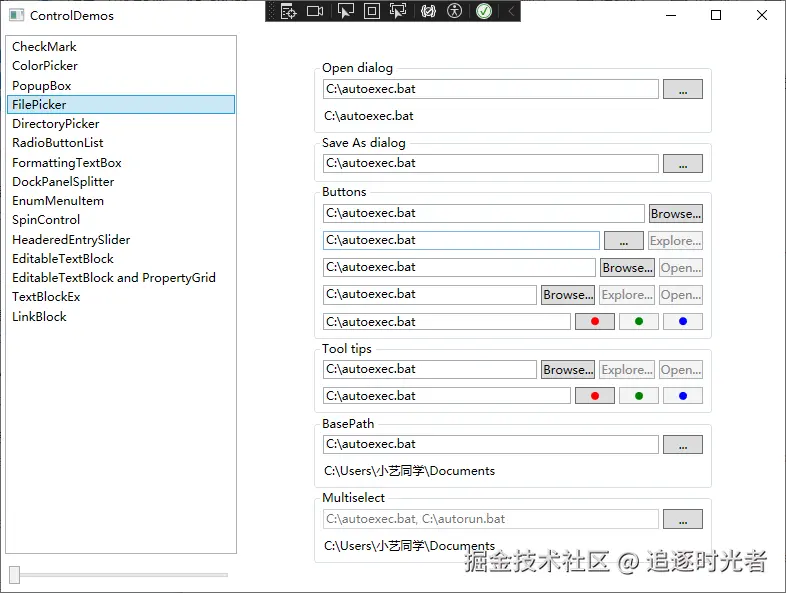 | FilePicker(文件选择器) | 带有“浏览文件”按钮的 TextBox。 |