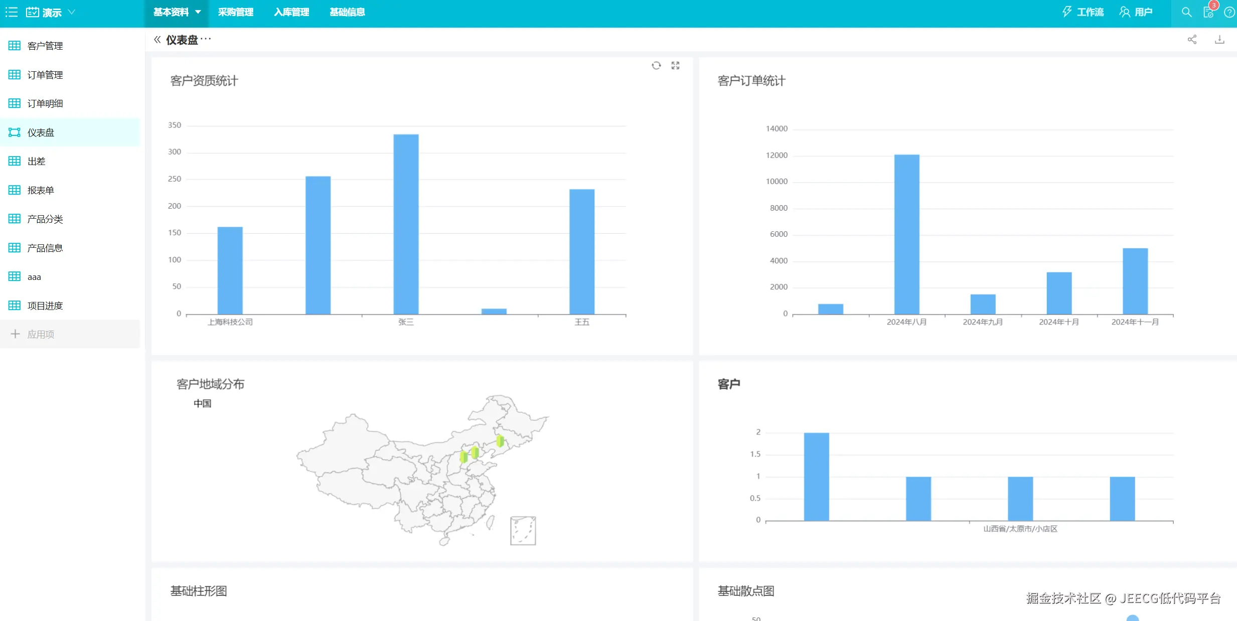 - 提供仪表盘设计器,用于配置门户和报表,在仪表盘中可以设计不同的统计图表,按钮、轮播图等。将数据以各类图表和图形化的方式,以视觉形式来呈现