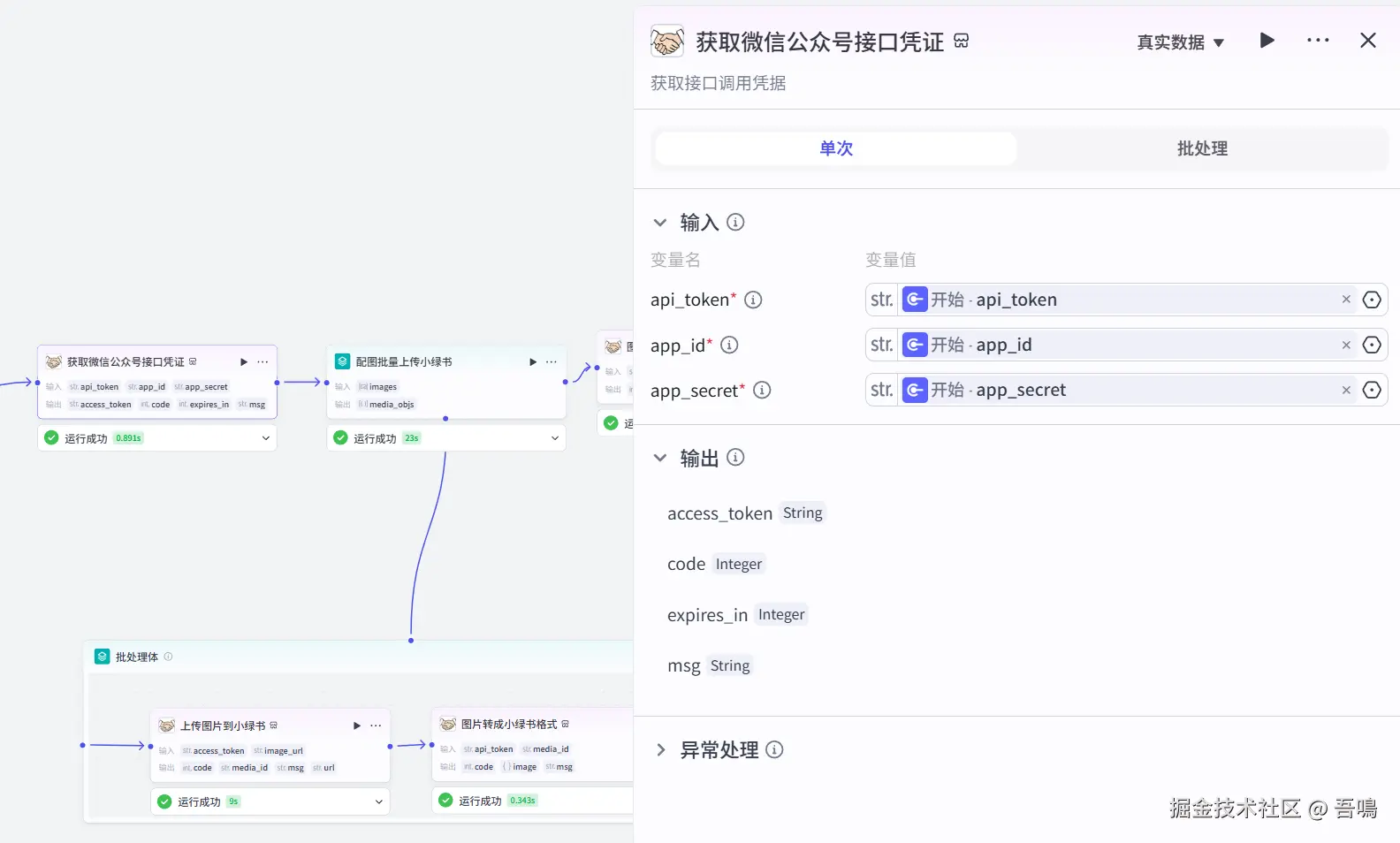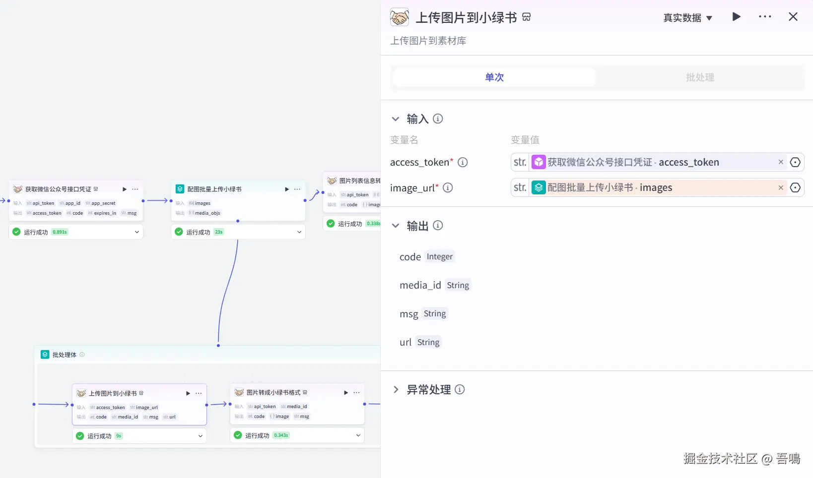 这个节点使用到了扣子三方插件【微信公众号接口】的【wx_upload_image】工具,用于把二创后的配图上传到小绿书中。