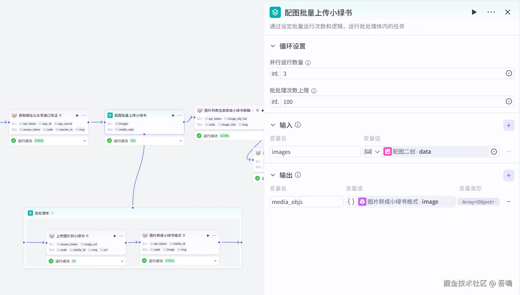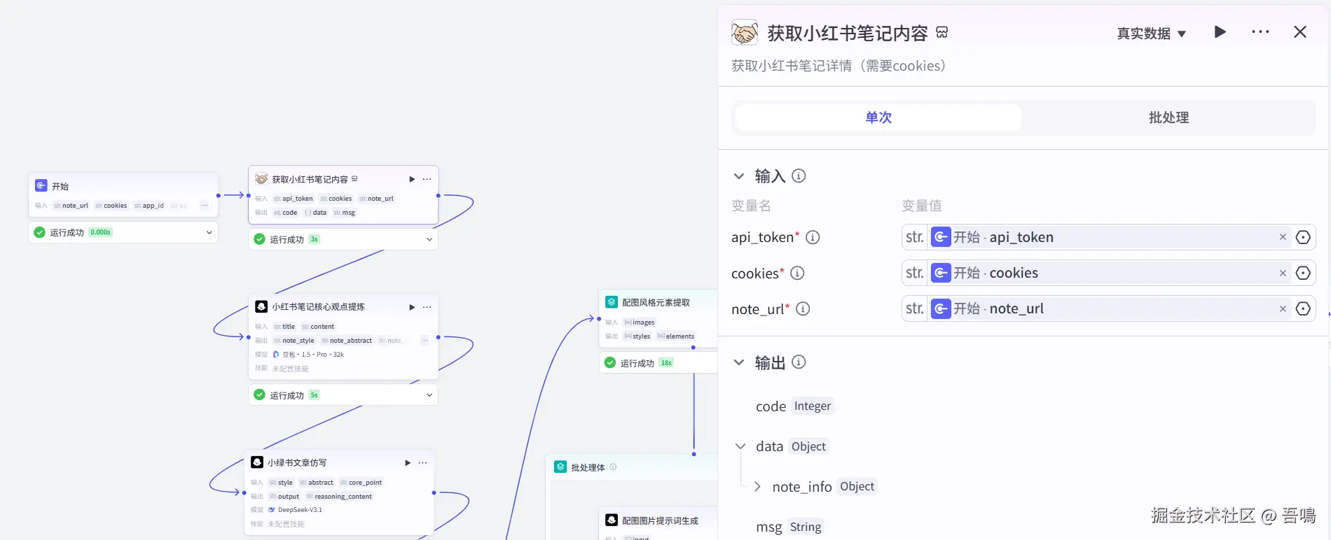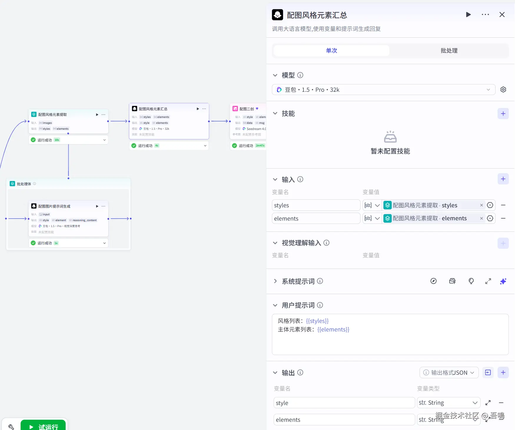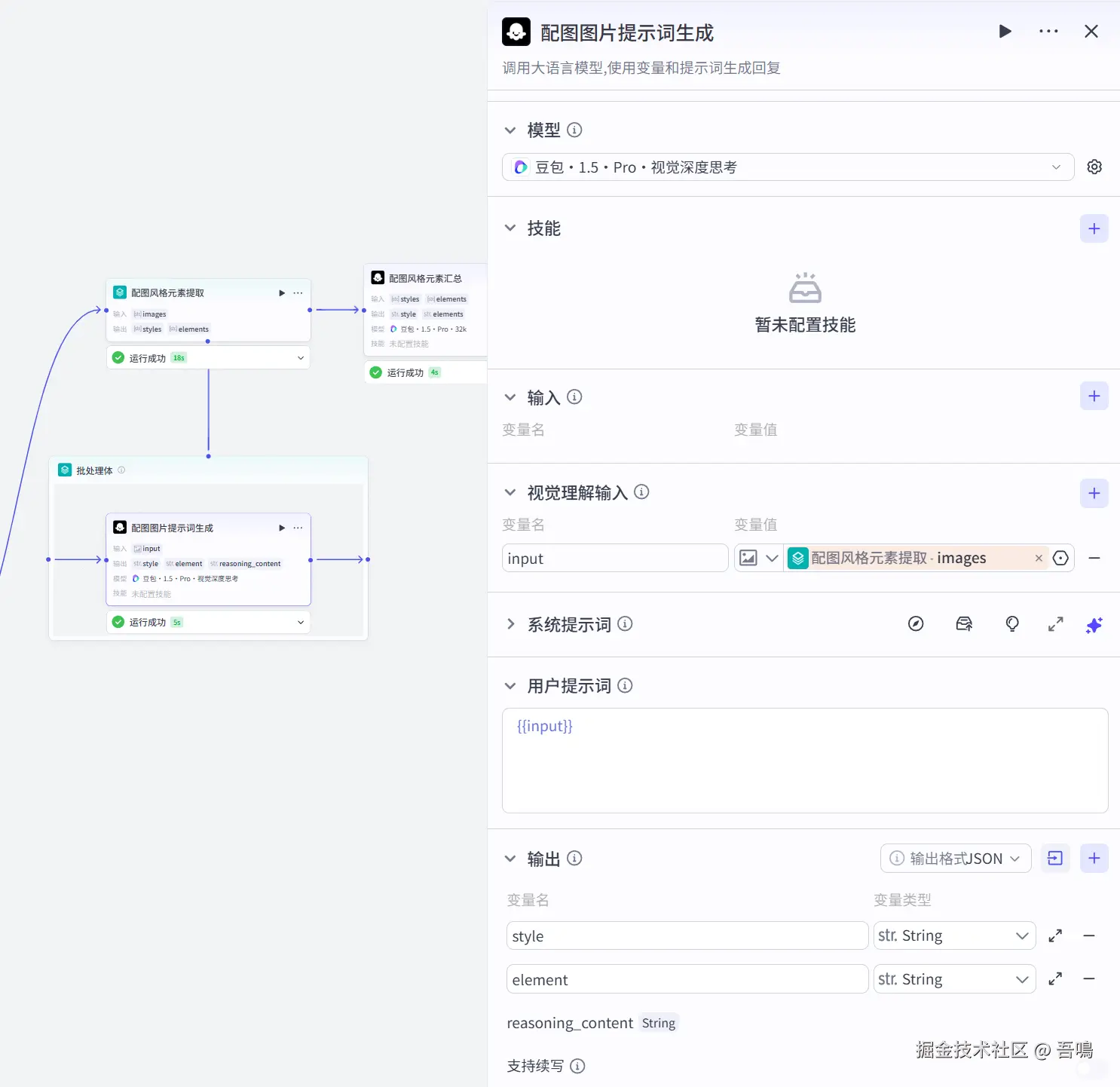 这个节点用来对小红书笔记配图的风格、主体元素进行分析,便于进行图片二创,使用到了扣子官方的批处理节点。