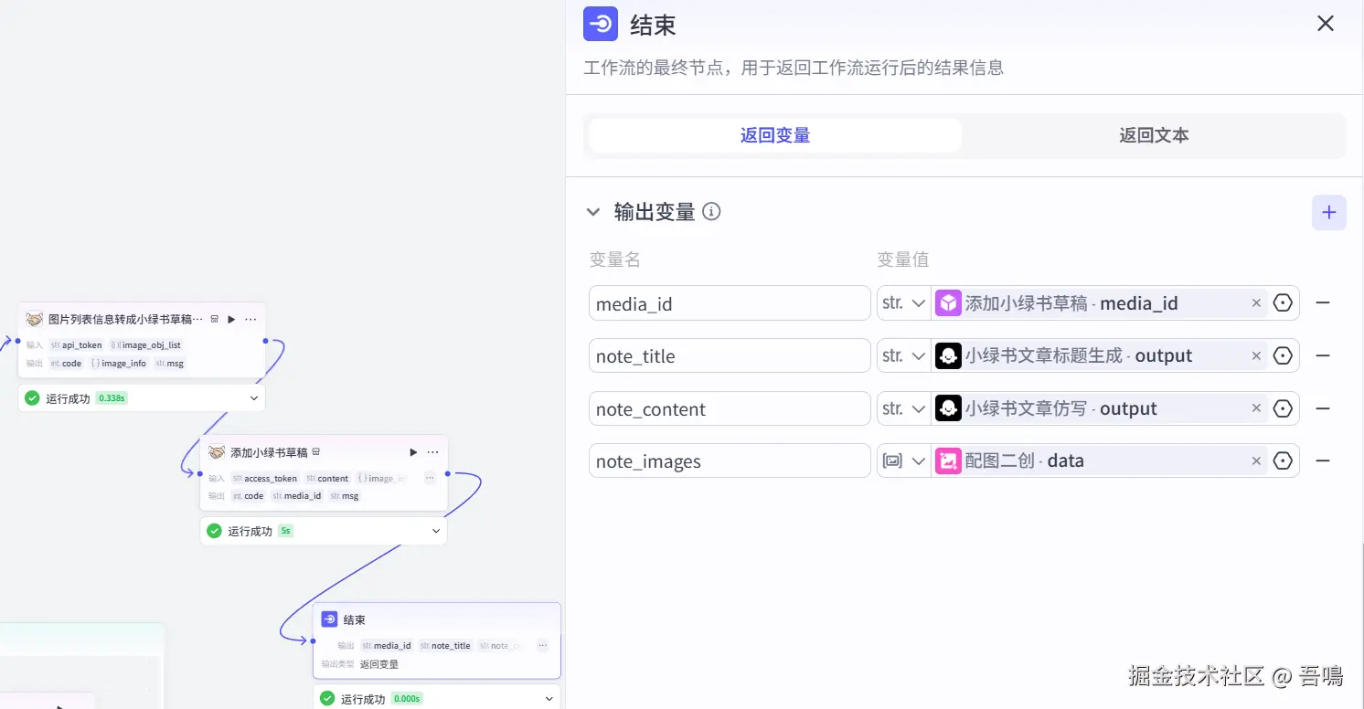 结束节点,media_id有值说明添加到小绿书草稿成功,note_title、note_content、note_images这些信息,如果你需要发小红书的话,可以拷贝这些信息去发送。