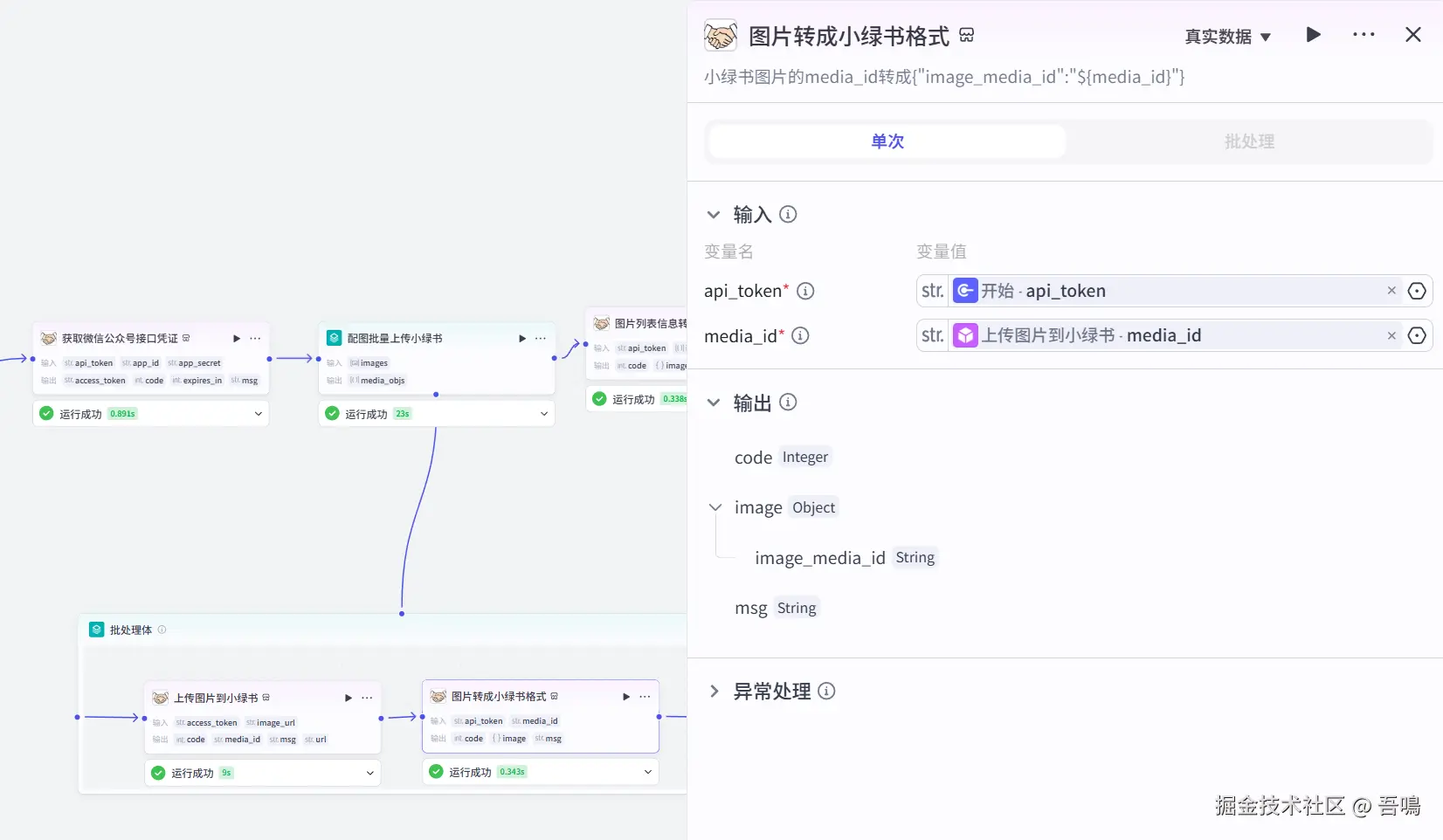 这个节点用来把上传图片拿到的结果转成小绿书图片的格式,使用到了三方插件【微信公众号工具箱】的【np_media_id_convert_to_obj】工具。