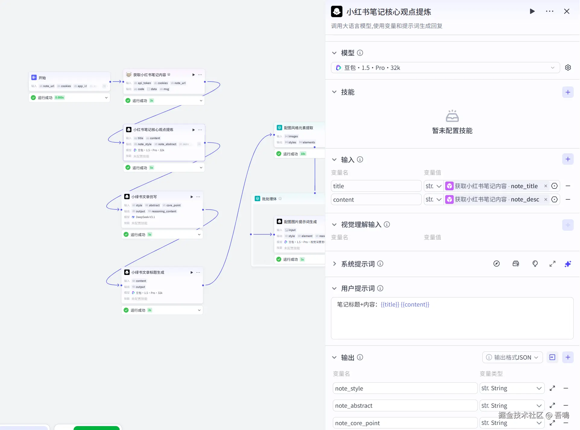 这个节点使用到了扣子官方的大模型节点,用于提取小红书笔记的核心观点。因本工作流提示词较多,文章篇幅原因,系统提示词我统一放到了文末。