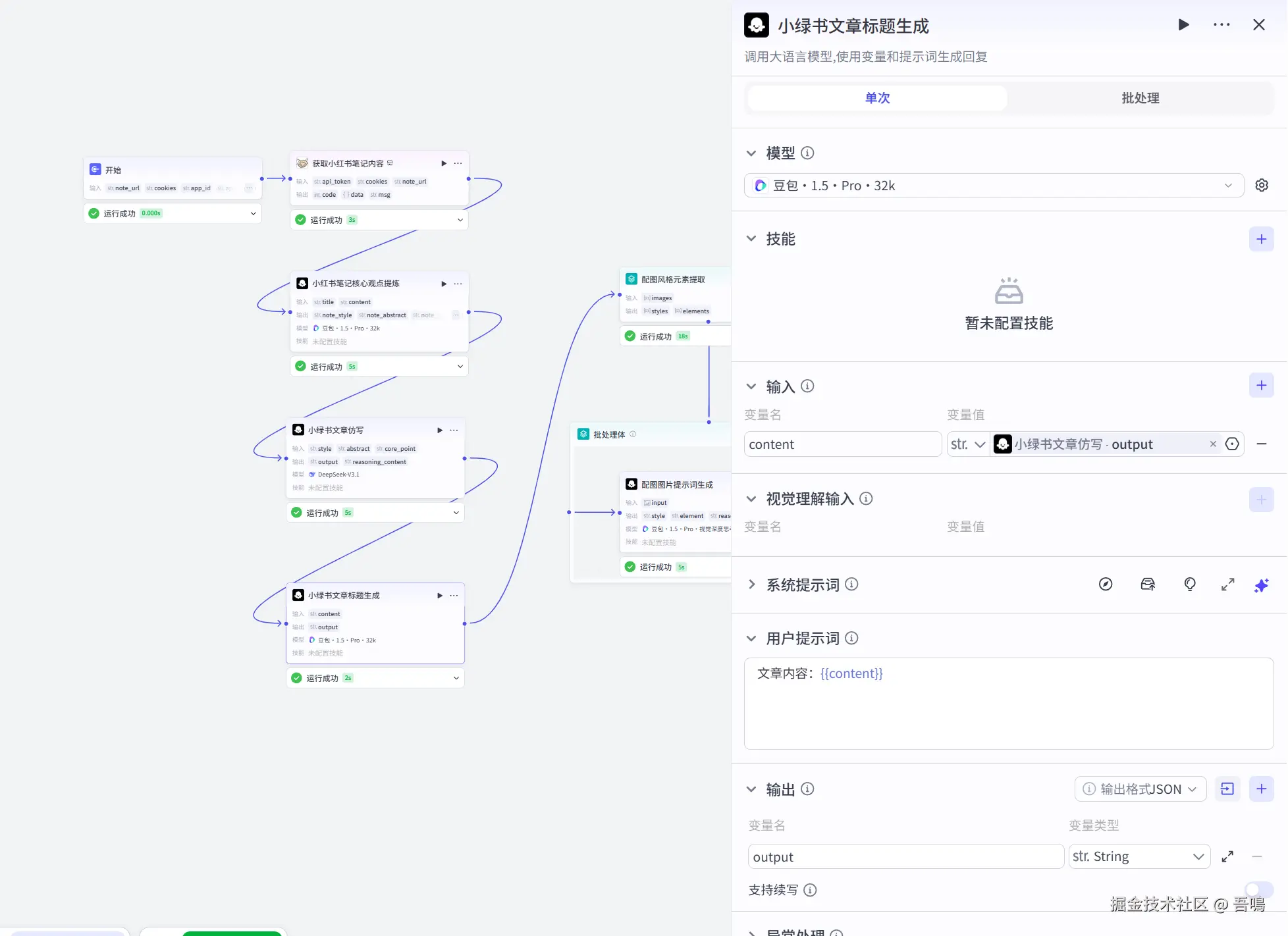 这个节点用来根据二创后的笔记内容来生成爆款的文章标题,使用到了扣子官方的大模型节点。