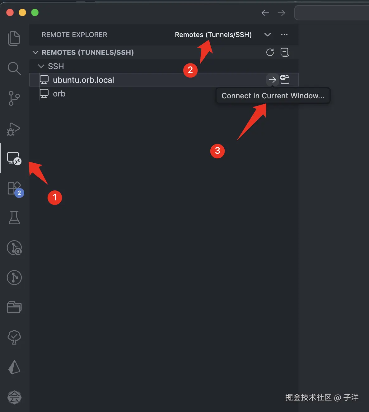 在左侧边栏打开 Remote Explorer,左上角选择 Remotes (Tunnels / SSH)。