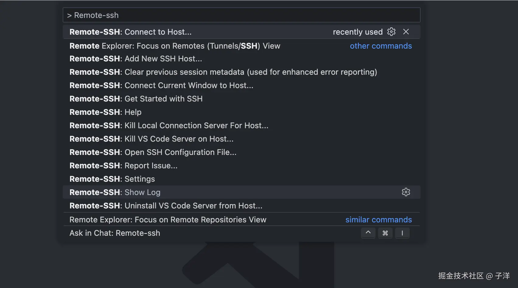 使用 cmd + shift + p 打开命令面板,输入 Remote-SSH,选择 Connect to Host。