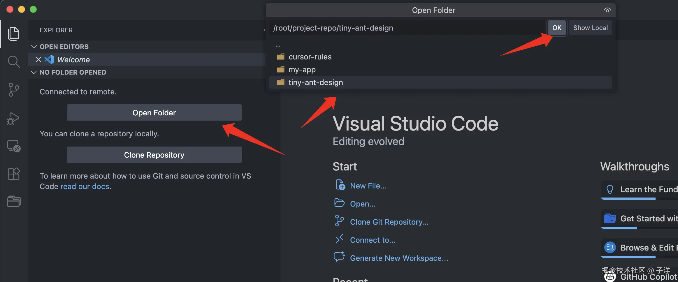连接完成后,点击 Open Folder,选择你在服务器上已经准备好的项目目录。