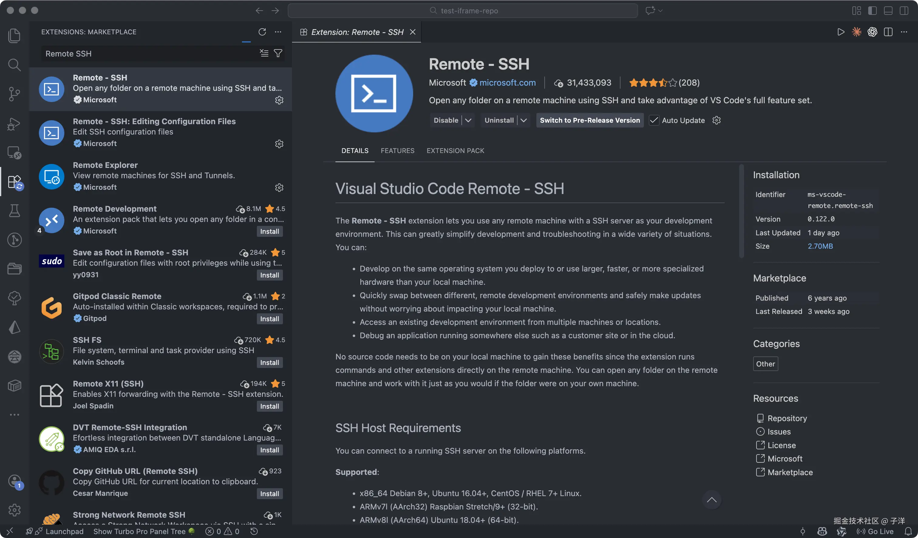 搜索并安装 Remote - SSH 插件,安装完成后,通常会自动附带以下插件: