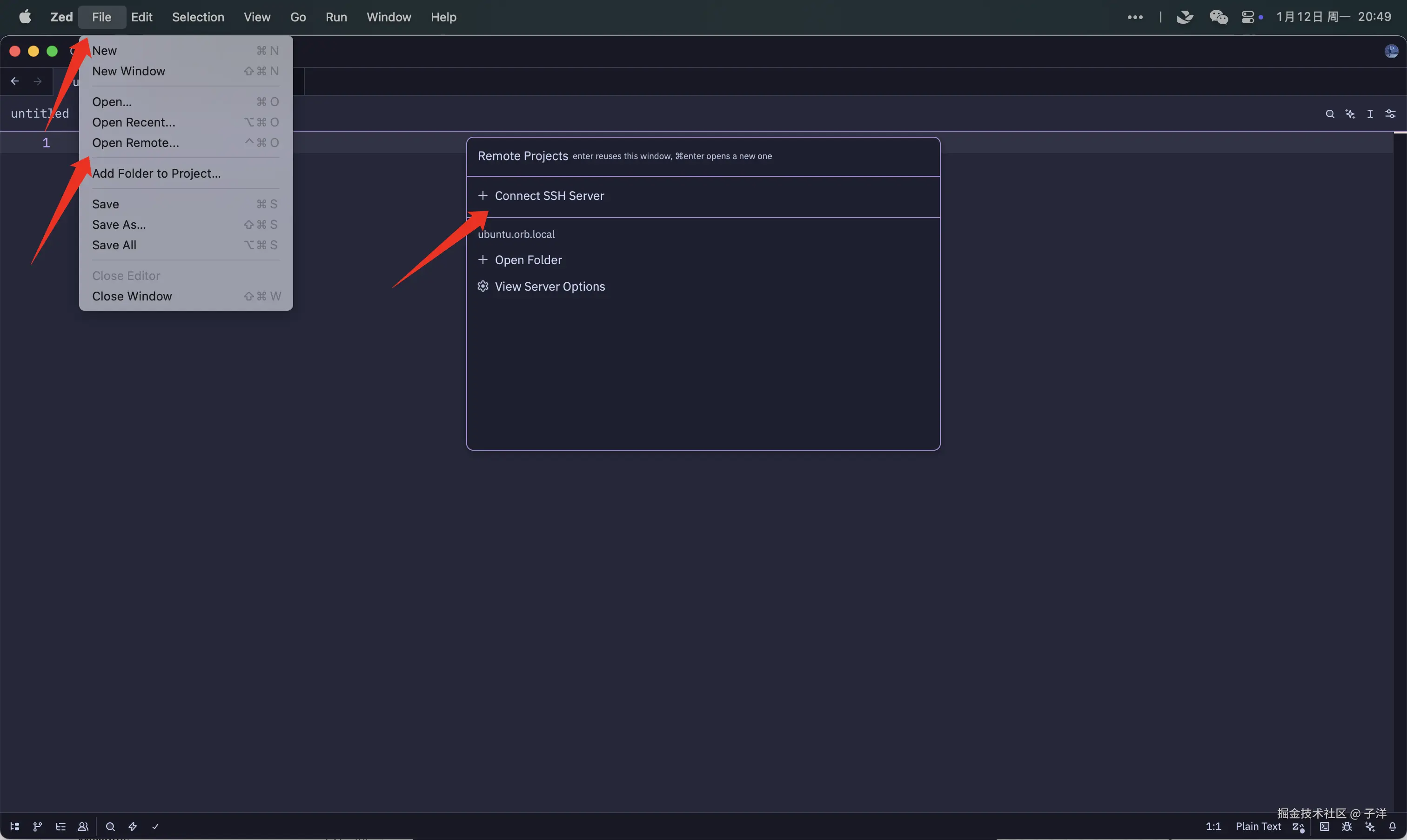 Zed 的远程开发流程比 VS Code 更轻量一些,但整体思路是一致的。下面同样按实际操作顺序来。