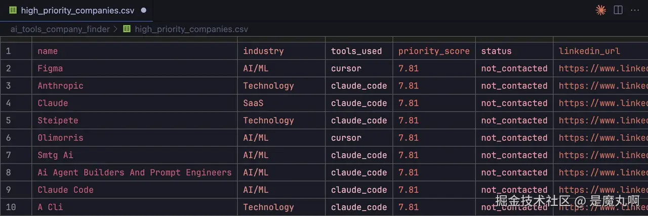 "我的产品会在代码助手查询中屏蔽敏感数据。因此 Claude Code 提出了在 GitHub 仓库中寻找潜在线索的想法,方法是在其中搜索实际的敏感值(以及在仓库中是否看到一些使用编码 agents 的证据)。这实际上很天才——不仅过滤掉了很多公司,还为线索提供了即时价值。这是它想出来的:仓库列表、优先级分数,甚至 LinkedIn URL。"
