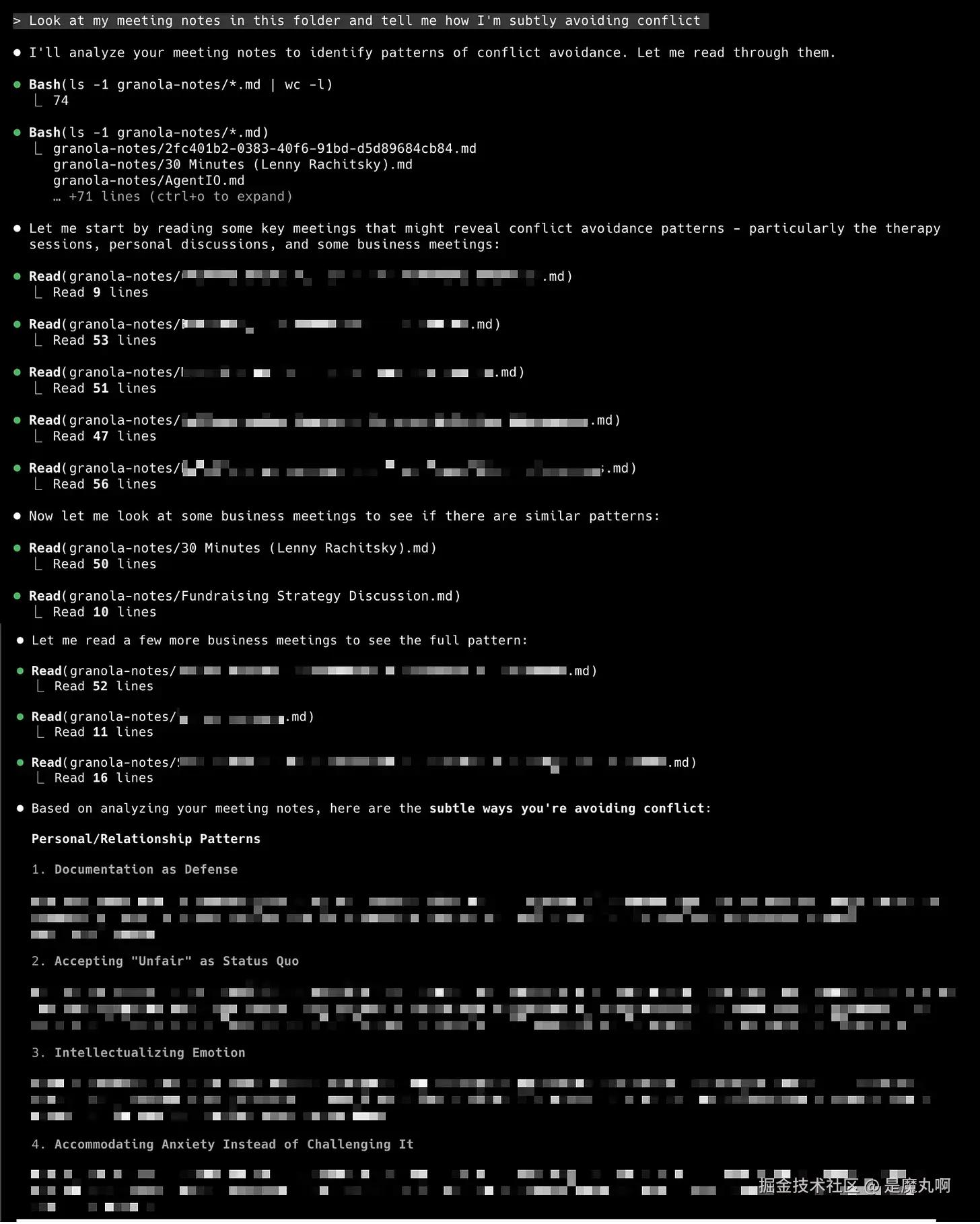 "我下载所有会议录音,将它们放在一个文件夹中,然后让 Claude Code 告诉我所有我微妙地避免冲突的时刻。"