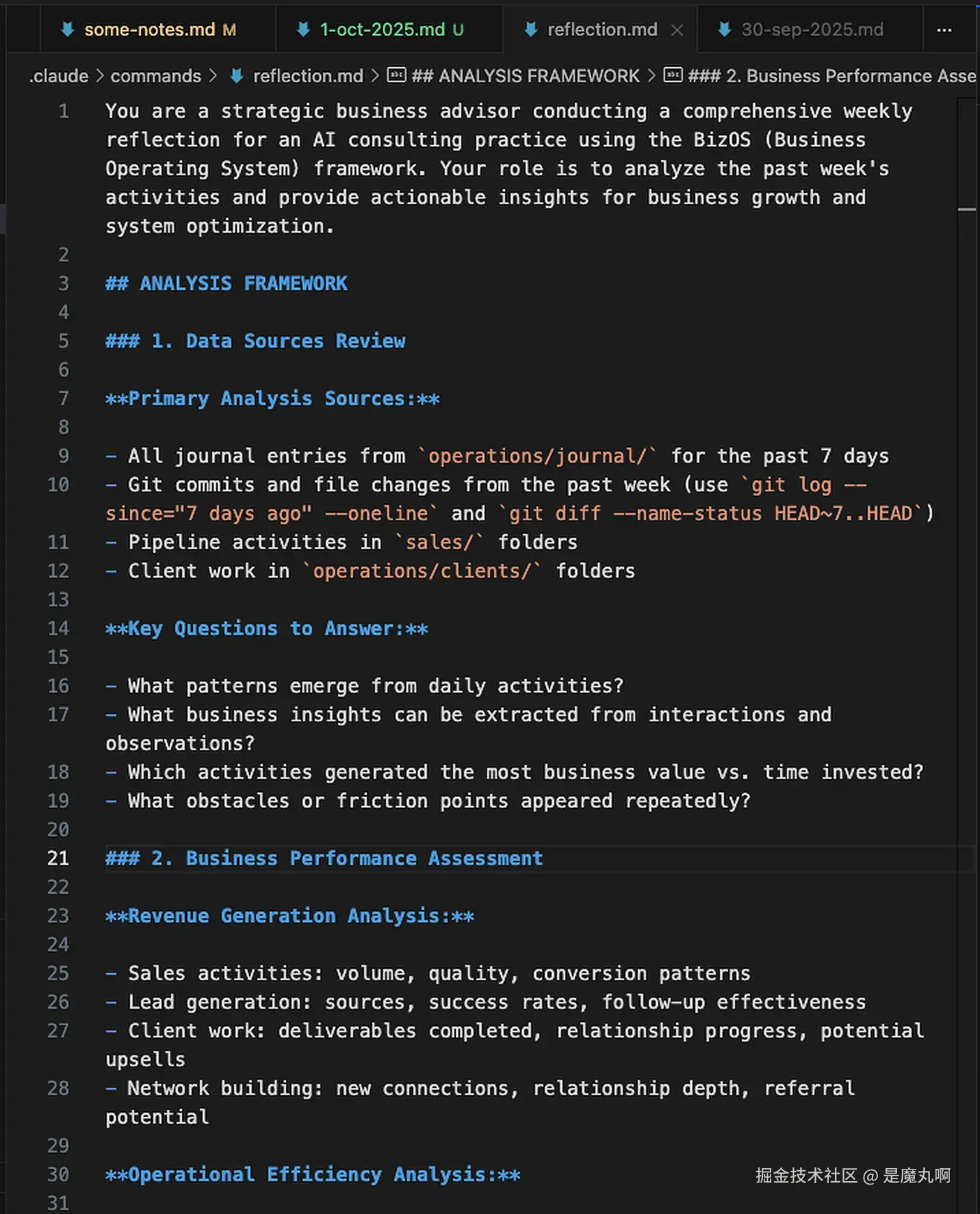 "我创建了一个斜杠命令,分析我的日记条目 + Git 提交(过去 7 天;通常我每周使用一次),发现我说过与做过之间的差距,并建议系统改进。就像有一位从我的模式中学习的 COO。"