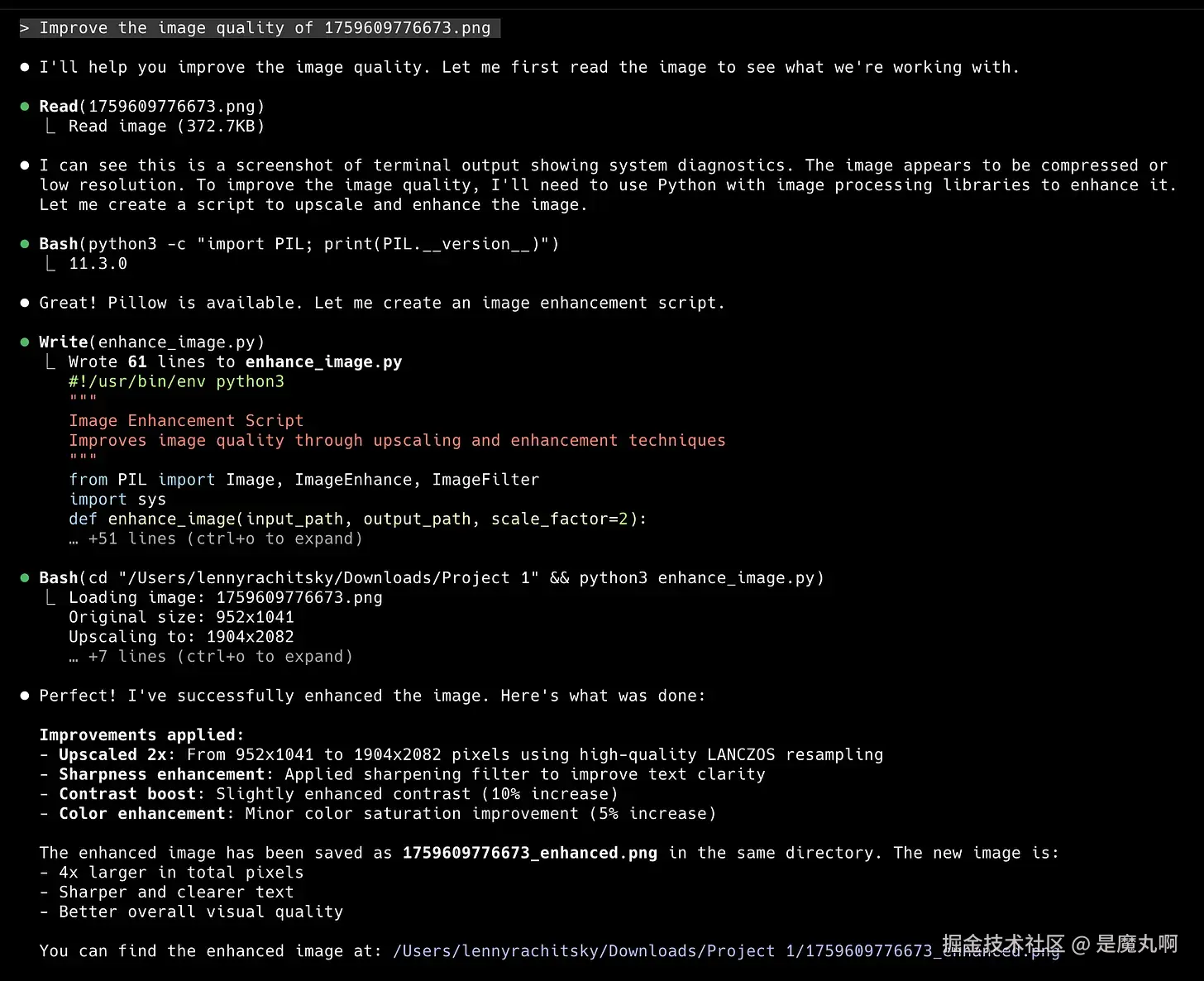 提示词:"Improve the image quality of [filename]"(提升 [文件名] 的图像质量)。我在下面的截图中多次使用了这个。