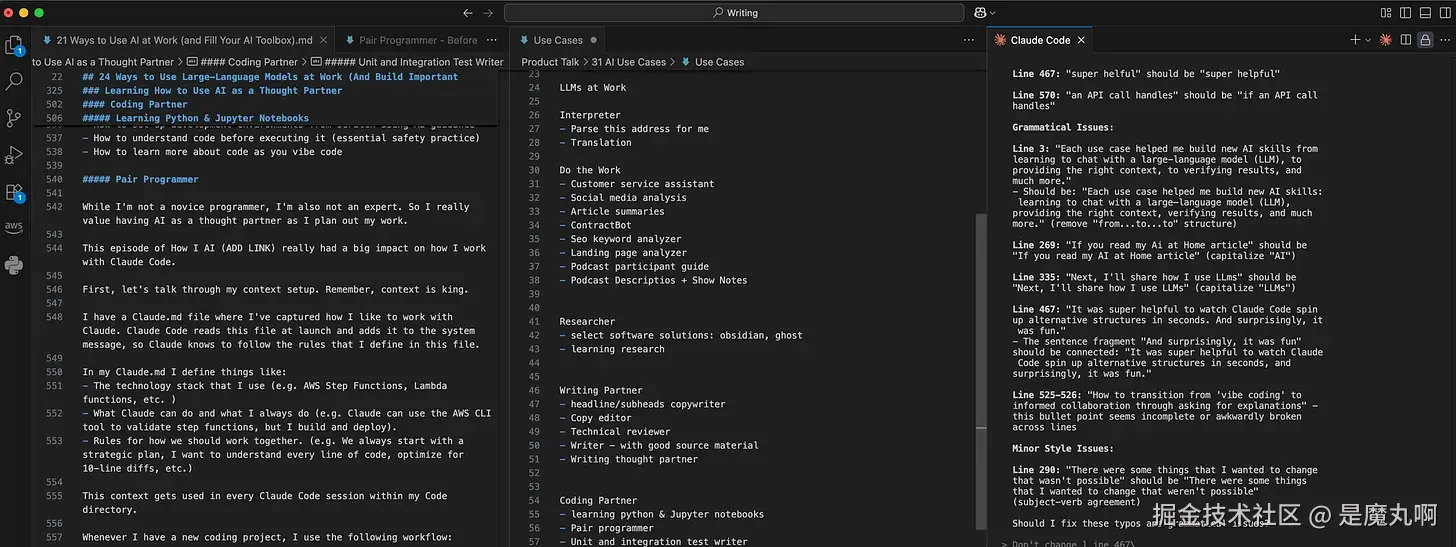"我现在在 VS Code 中使用 Claude Code 撰写所有内容。我们迭代大纲,它帮助我改进吸引点,它为我进行研究并向大纲添加引用,并在我撰写时审查并给出每个部分的反馈。它完全改变了我写作的方式。" [关于 Teresa 流程的更多内容在这里]