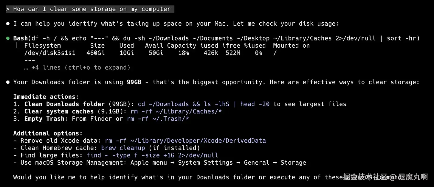 我使用它来检查平均负载、内存压力、磁盘空间、卡住的进程和交换活动,然后它会深入查找实际导致问题的原因。它可以计算缓存大小、检查 Docker 使用情况、查找占用空间的 Time Machine 快照等。