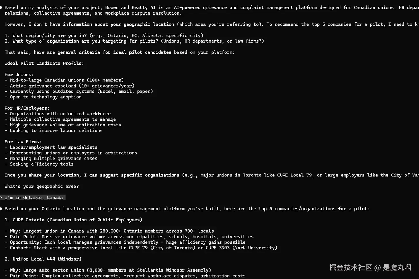 "我实际上只是输入:看看我在构建什么,确定我所在地区的前 5 家适合为此做试点的公司。然后我去 LinkedIn 并给他们发消息。如果不清楚,我会在我的应用程序代码的源目录中执行此操作,这样它做的第一件事就是弄清楚我在构建什么。"