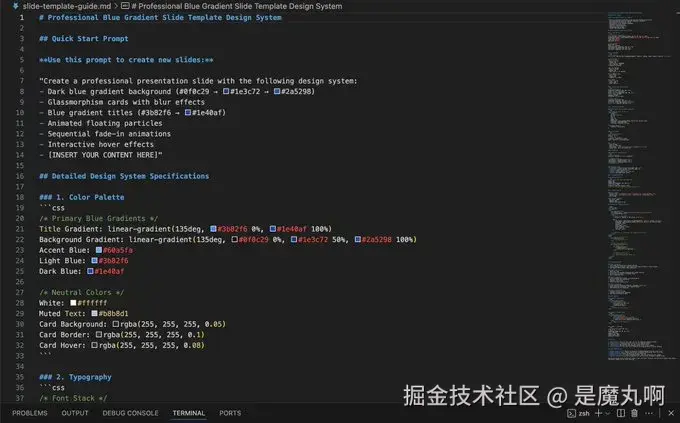 这个模板变成一个 .md 文件(我在下面放了该文件的一个片段)。使用 html,你可以非常具体——'把这个措辞改成那个'——然后你可以使用 MCP 来查看'幻灯片'以显示你的意思以获得更大的上下文。有了这个,我添加了更多的幻灯片,并使用模板更改了其他幻灯片以保持相同。是的,幻觉会发生,必须接受这一点。知道自己想要什么并能够表达自己想要什么的人不会有太多麻烦。