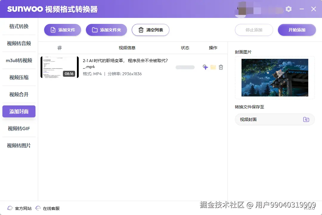 可以选一张JPG/PNG当封面,嵌入到MP4的metadata里。1GB视频加封面,耗时3.2秒,文件体积增加0.5% (封面被压缩成缩略图)。