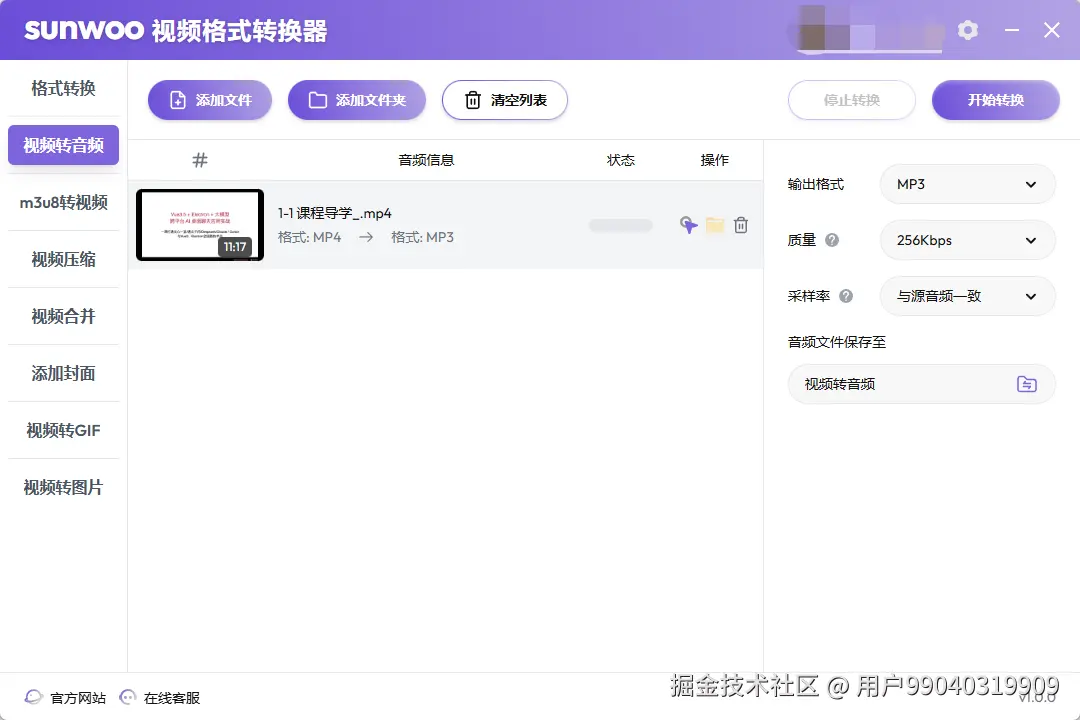 很多人没注意,视频转音频有两种做法:一是提取音频流(demux),二是重新编码。Sunwoo默认走demux,1GB视频提取音频只要28秒,文件体积14.7MB(AAC 128kbps)。
