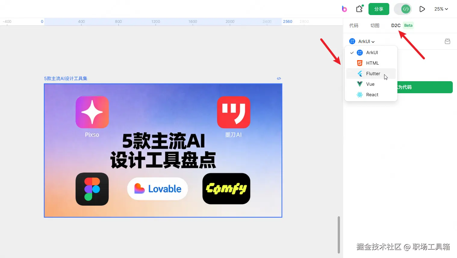 此外,Pixso配备D2C设计稿转代码的能力,你可以将编辑好的设计稿转转为可在生产环境使用的工程化代码,包括鸿蒙ArkUI、Flutter、Vue和React代码,从用研、原型、设计到交付一步到位,告别在多个软件间来回横跳。