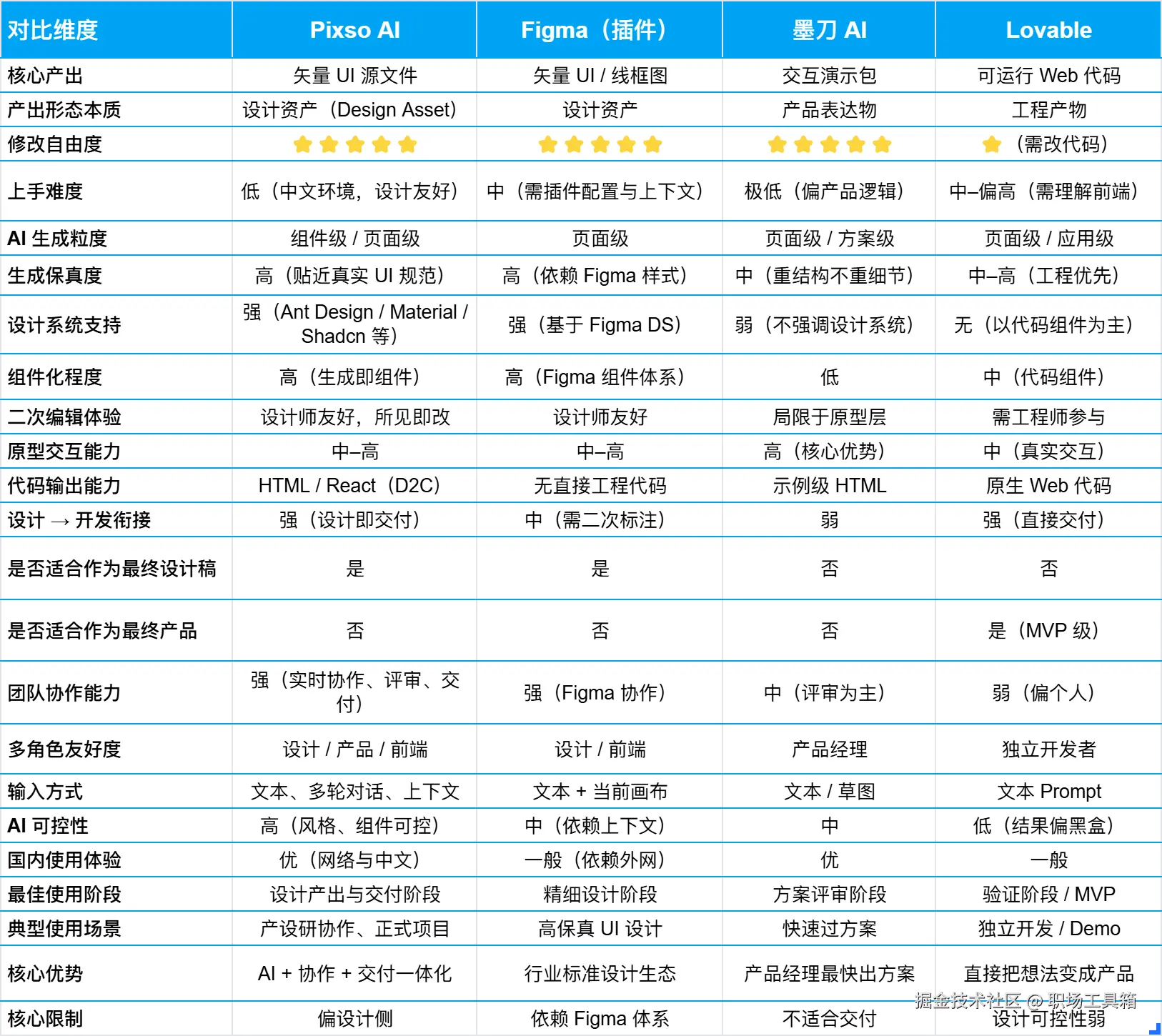 为了帮助大家快速根据团队现状做出决策,我们将上述AI原型设计工具的核心特性进行了横向对比: