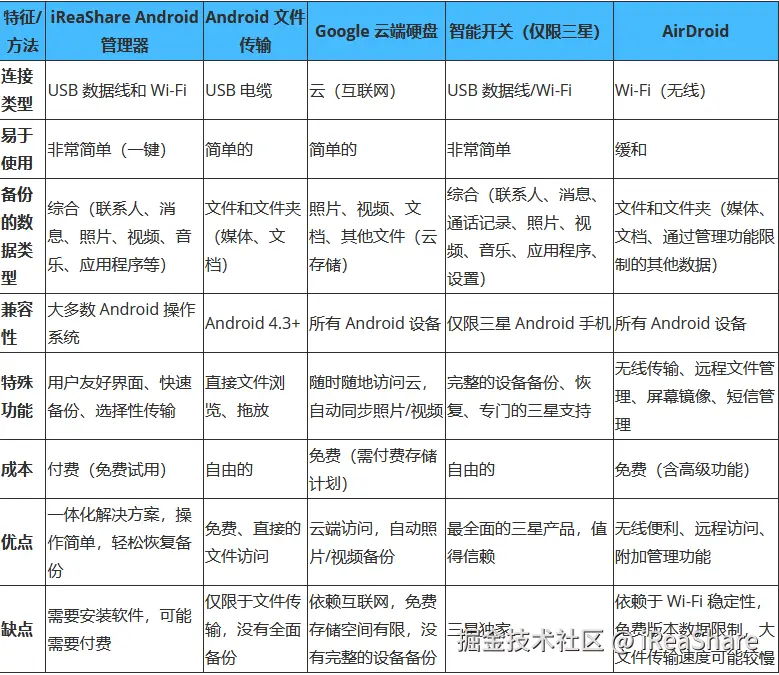 通过以上方法,您现在可以使用iReaShare Android Manager一次性将 Android 数据备份到 Mac,使用 Android File Transfer 手动备份文件,使用 Google Drive 或 Dropbox 等云服务完成备份,或使用 AirDroid 备份文件。哪种方式最佳取决于您的需求。总之,定期备份有助于确保您的数据无论发生什么情况都保持安全、可恢复且可访问。