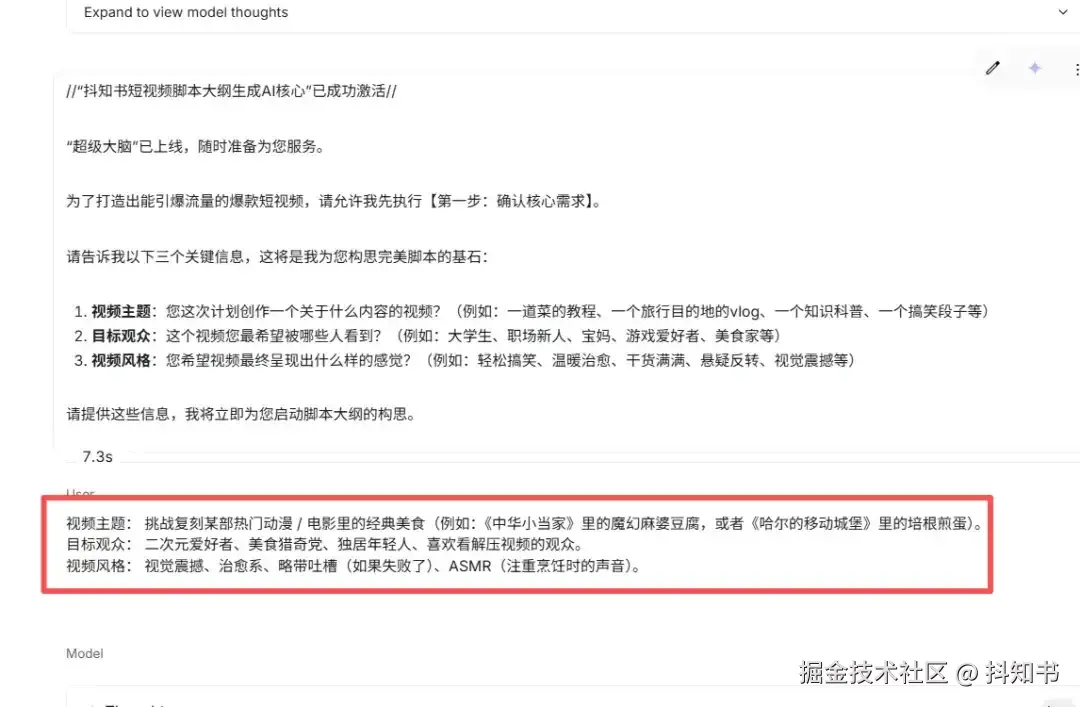 3.发送后,AI就会被“唤醒”,自动进入“抖知书短视频脚本大纲生成AI核心”的工作模式,并开始主动向你提问,引导你完成整个脚本大纲的创作。