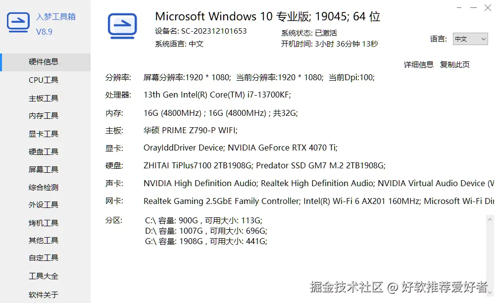入梦工具箱以开源形式发布,专注提供完整的PC硬件检测服务。其核心优势体现在以下方面: