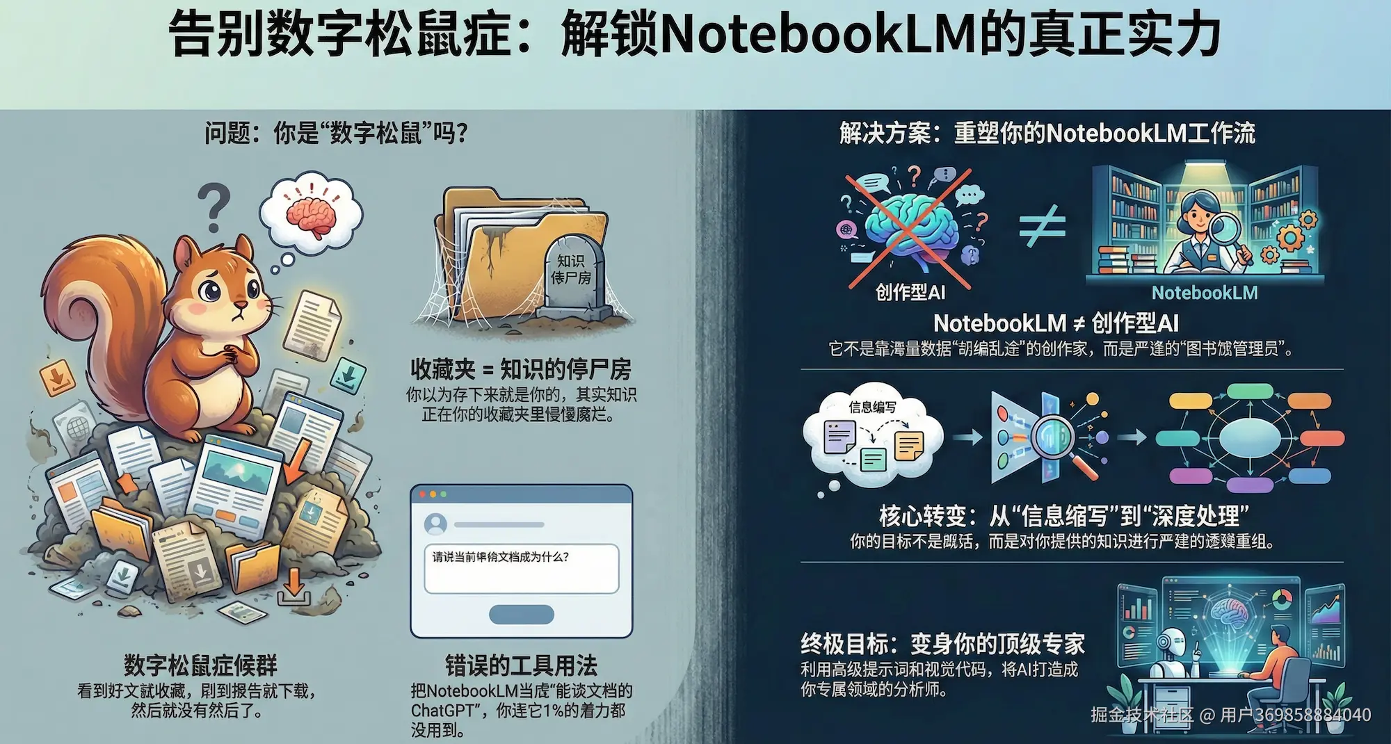 看到深度好文,收藏;刷到行业研报,下载;看到大神推荐的书单,存进网盘。 然后呢?没有然后了。 那些你以为“存下来就是你的”的知识,其实正在你的收藏夹里慢慢腐烂。你的 NotebookLM 如果只用来上传文档,那它就不是知识库,而是你**“知识焦虑的停尸房”**。