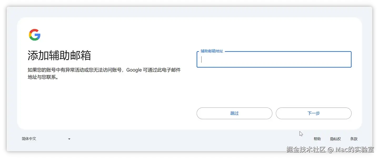 这一步填写辅助邮箱,有人说填写国内邮箱会被检测出来标记的,其实这个说法也不靠谱,谷歌对辅助邮箱并没有严格要求,但你必须要填写真实的邮箱,以证明自己是真人。