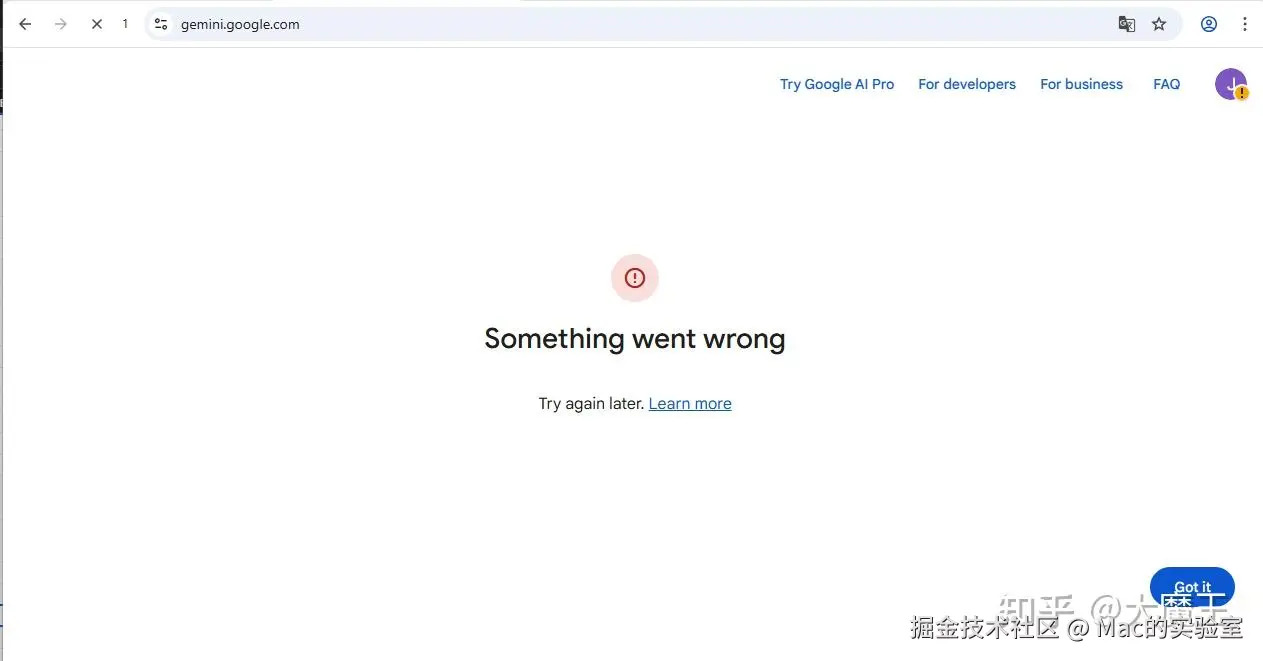 再也没有出现【“Something went wrong Try again later.”】的错误页面提示了!如果你按照上面步骤一步步操作后打开依然是失败结果,可以到公众号:Mac的实验室 后台回复 ai 获取最新开通Gemini的技术方法,大神会实时检测开通方法是否有效,帮助大家进一步排除问题,直到成功用上Gemini!