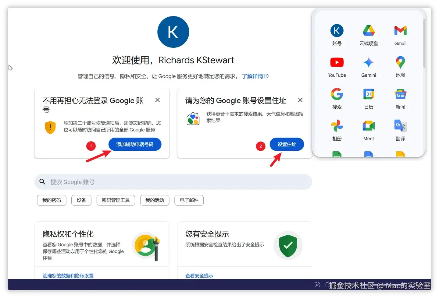 看到谷歌这两个安全提示,一个是添加辅助电话号码,一个是设置地址。