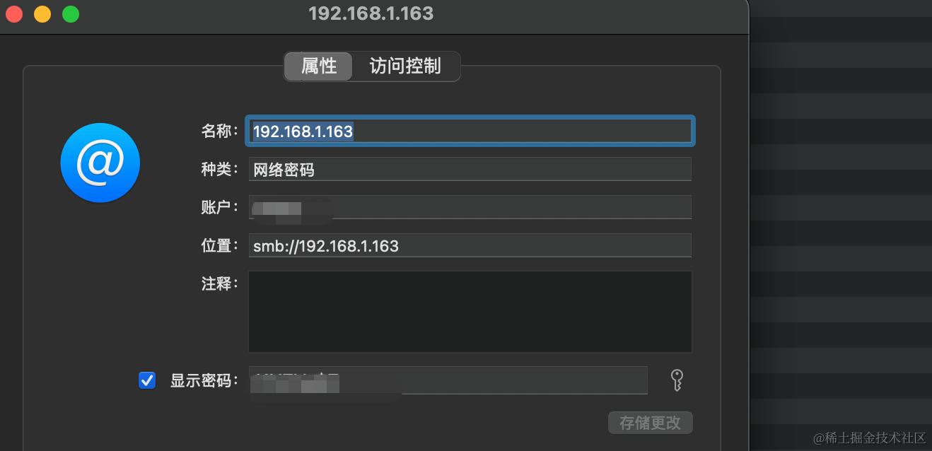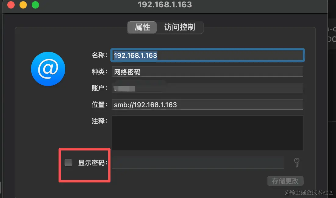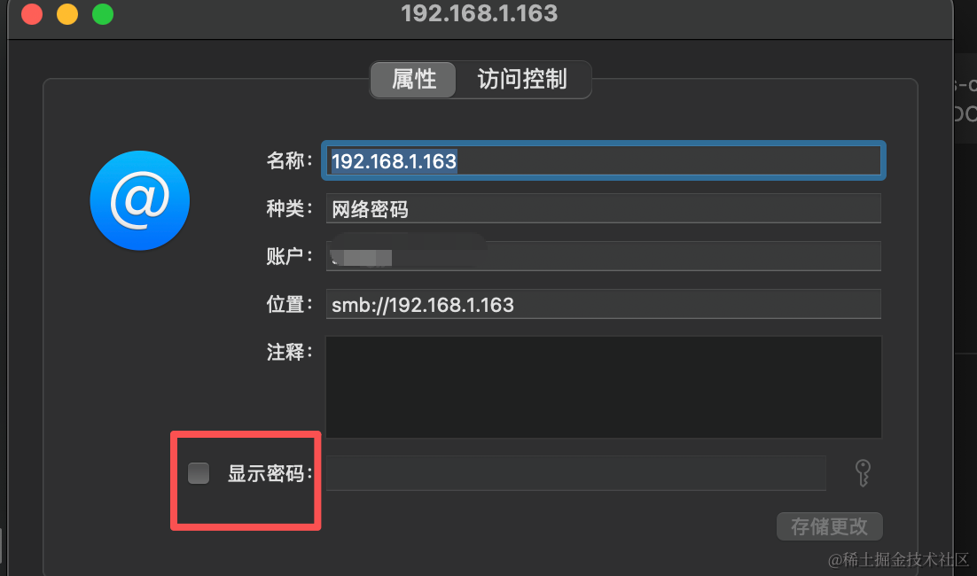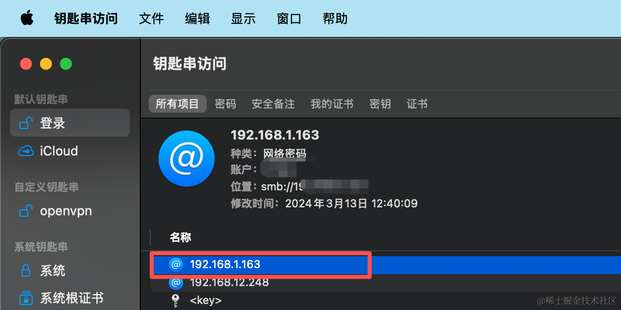 打开钥匙串访问程序,然后找到这个你nas的ip对应的项,双击:选中显示密码