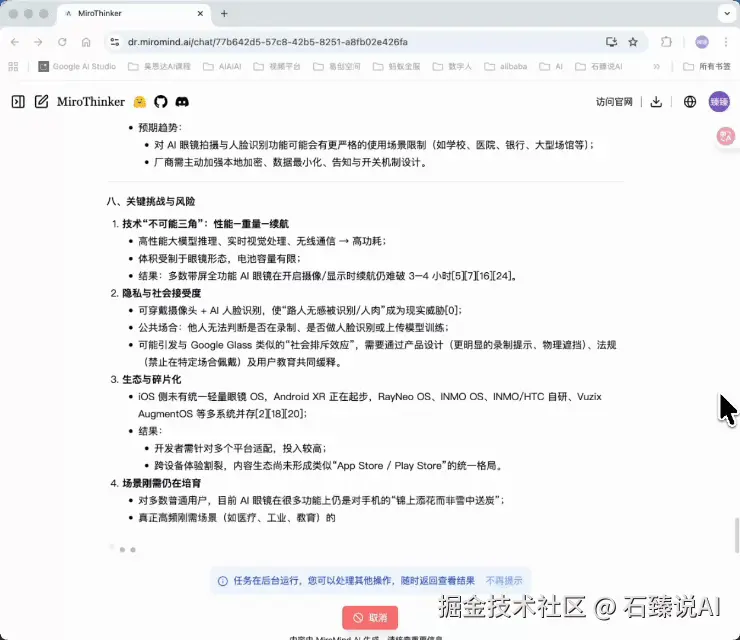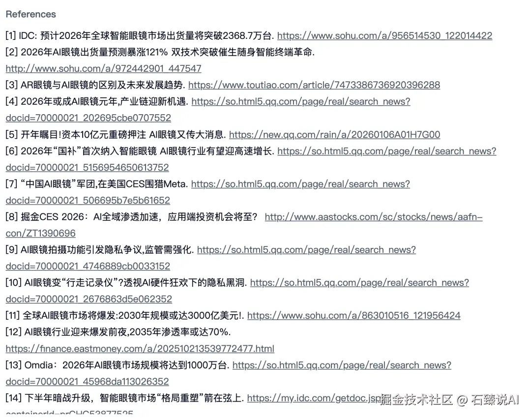 - 拆解与规划它没有立即生成文本,而是先展示了它的思考路径(Thinking Process)。它将任务拆解为“市场规模”、“核心玩家(Meta/Ray-Ban, Apple, 国内厂商)”、“技术瓶颈”、“未来趋势”等子任务 。