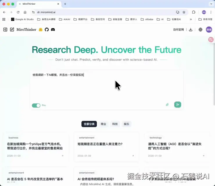- 普通用户/决策者:直接使用 Web 端,体验“顶级研究员”帮你查资料的快感。👉 点击注册体验 (dr.miromind.ai)