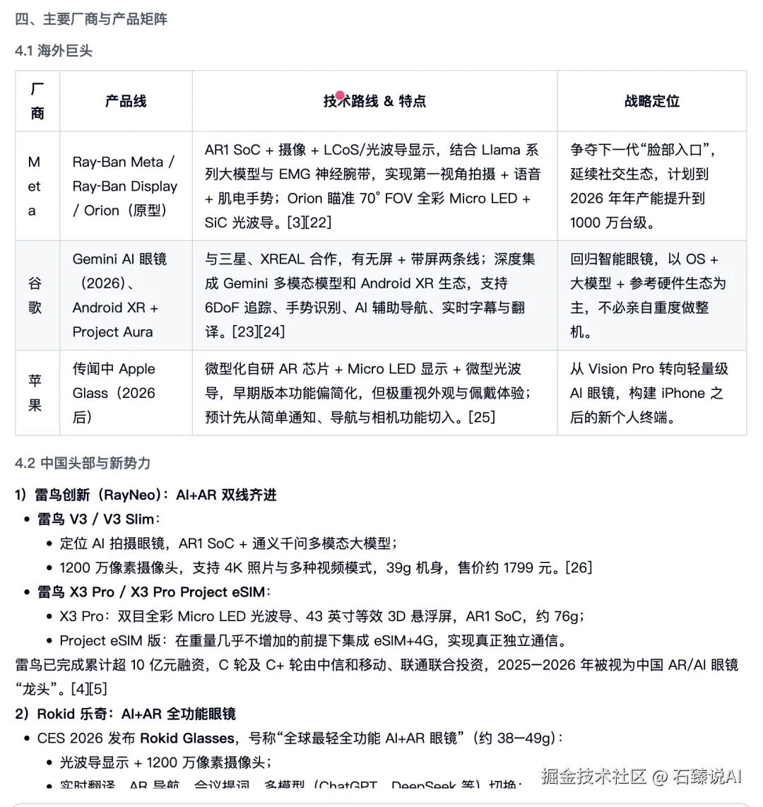 - 拆解与规划它没有立即生成文本,而是先展示了它的思考路径(Thinking Process)。它将任务拆解为“市场规模”、“核心玩家(Meta/Ray-Ban, Apple, 国内厂商)”、“技术瓶颈”、“未来趋势”等子任务 。