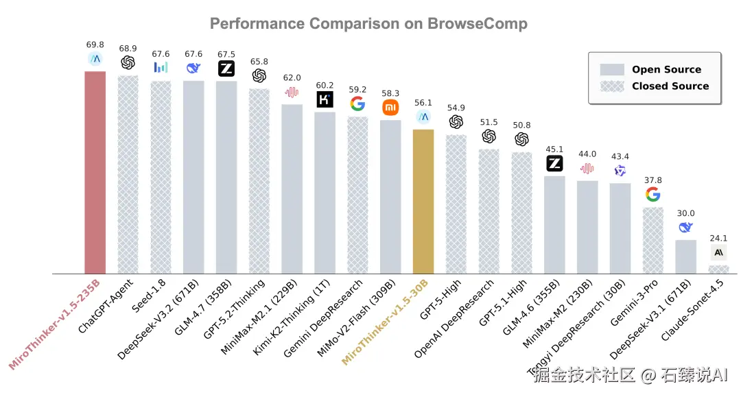 这意味着什么? 一个仅有 30B 参数的开源权重模型,在搜索与推理的综合能力上,几乎快要追平了 Google 顶级的闭源搜索模型 Gemini DeepSearch。