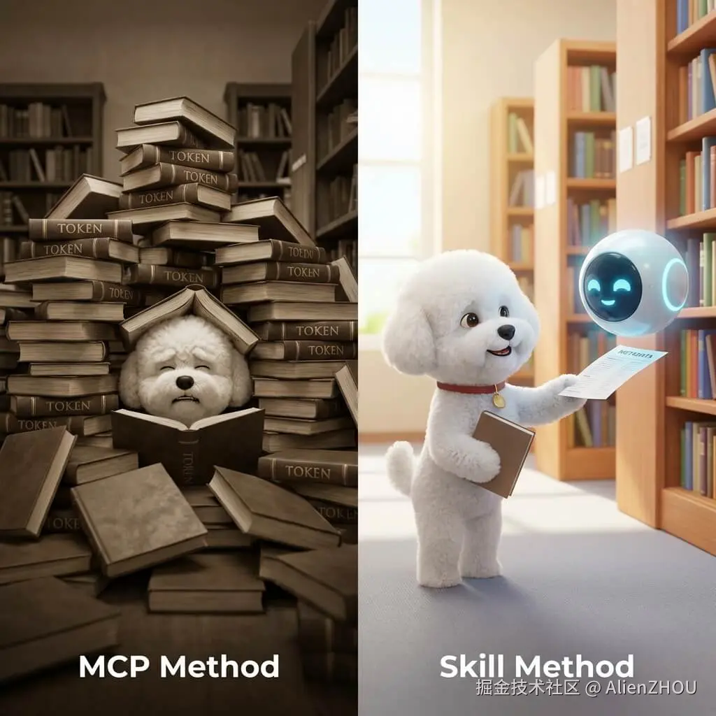 - Skill 方式:启动时只加载名称和描述(约 100 tokens/skill)。需要哪个,再加载哪个的详细指令。