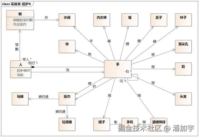 从图中可以看到,类图做了进一步抽象,不再有手、口罩等类,而是抽象为“人体部位类型”、“装备类型”。这是把泛化转为关联来处理。冰箱也看作房屋的一个区域,没有单独的类。