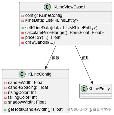 - KLineViewCase1 依赖 KLineConfig:KLineViewCase1内部持有KLineConfig实例,用于获取绘制参数(宽度、间距、颜色等)