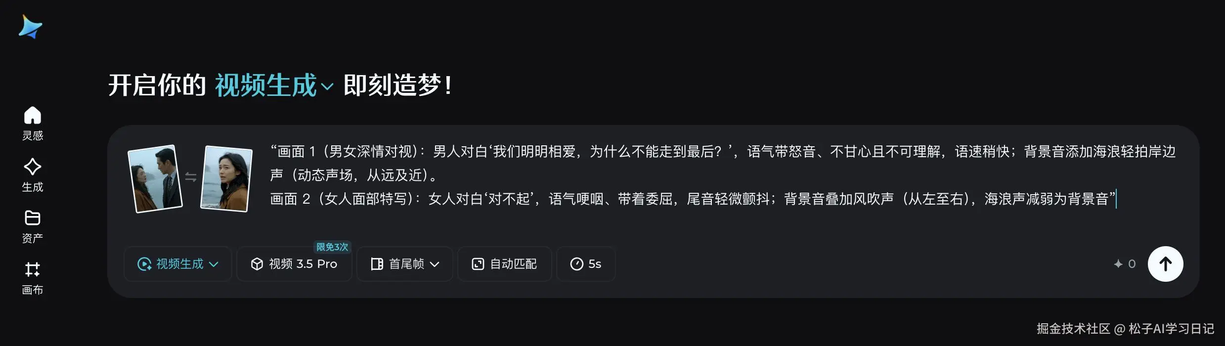 画面 2(女人面部特写):女人对白‘对不起’,语气哽咽、带着委屈,尾音轻微颤抖;背景音叠加风吹声(从左至右),海浪声减弱为背景音”(划重点:对白要写清角色情绪、语气和语速,背景音标注动态效果,AI 生成时会自动匹配口型和场景氛围)