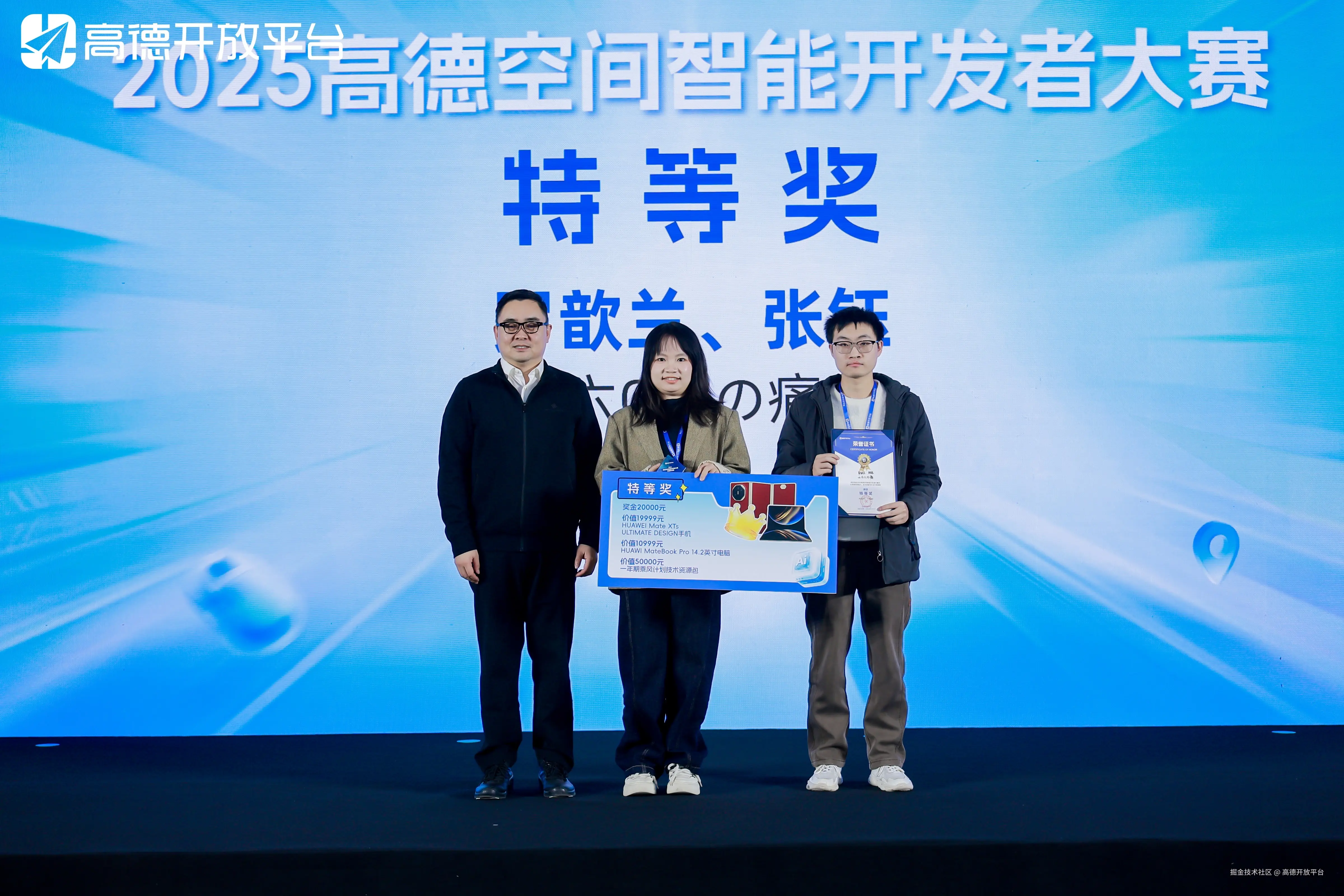 会上揭晓了高德空间智能开发者大赛的获奖名单,并为获奖团队举行了隆重的颁奖仪式。来自同济大学的罗歆兰和同伴带来的路演项目是——无障碍多模态AI安全导航助手,通过实时图像分析与智能推荐,轻松规划出行路线、识别障碍物,助力残障人士出行,成为现场关注焦点,并获得了本次大赛的特等奖。“活动搭建了一个很好的平台,现场看到了很多优秀的创新方案,不仅拓展了思路,更感受到了AI蓬勃的创造力。”她表示,回去后将不断优化完善路演项目,真正推动技术的突破与应用的落地。