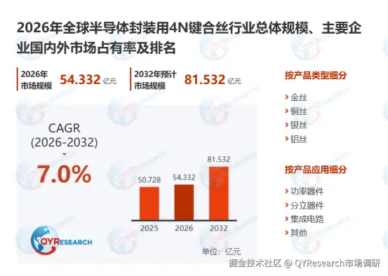 半导体封装用4N键合丝的发展深受下游应用市场强劲拉动与成本控制压力的双重驱动,同时市场需求呈现出鲜明的技术导向与细分领域差异化特征。在市场拉动因素方面,一是高端应用需求激增,随着人工智能、高性能计算(HPC)、新能源汽车尤其是基于SiC/GaN宽禁带半导体功率模块的快速发展,对芯片散热效率、长期可靠性和极端环境适应能力提出严苛要求,直接刺激了对高端4N键合丝的强劲需求,该类键合丝凭借优异的导电性、低电阻、抗氧化性和机械强度,成为实现高功率密度与高可靠性封装的首选互联材料;二是成本控制压力持续加大,金价长期高位运行并波动剧烈,显著推高传统4N金线的总体拥有成本,迫使封装企业加速“以铜代金”进程,高性能镀钯铜线及铜合金线以更低的材料成本(通常仅为金线的30%-40%)和接近甚至部分超越金线的综合性能,对中低端及部分高端市场的4N金线形成强劲替代压力。在核心市场需求的具体指向方面,市场需求并非均匀增长,而是高度聚焦于特定技术痛点:首先,AI/高性能计算领域追求极高带宽与低延时互联,要求键合丝具备极低电阻率、极低寄生电感和在高频信号下的稳定传输特性,从而支撑HBM高带宽存储器、多芯片堆叠及异构集成等先进封装;其次,汽车电子与功率半导体领域对耐高温、抗振动疲劳寿命及长期可靠性要求极为严苛,尤其在新能源汽车电驱、逆变器及车载充电模块中,需要键合丝能够在200°C以上高温、剧烈热循环及振动环境下保持键合点完整性和电学稳定性,这直接推动高可靠性复合合金金丝及增强型4N金丝的研发与量产;再次,5G通信、射频前端及物联网设备对终端小型化、轻薄化需求强烈,进一步强化了对键合线径微缩(向15μm及以下发展)、高密度键合工艺兼容性以及多层堆叠可靠性的要求。这些市场拉动因素与细分需求指向共同作用,不仅巩固了4N键合丝在高端封装领域的核心地位,也加速其向更高性能、更低成本与更强环境适应性方向的迭代升级,确保在半导体产业向智能化、电动化、高频化演进过程中持续发挥关键互联作用。
