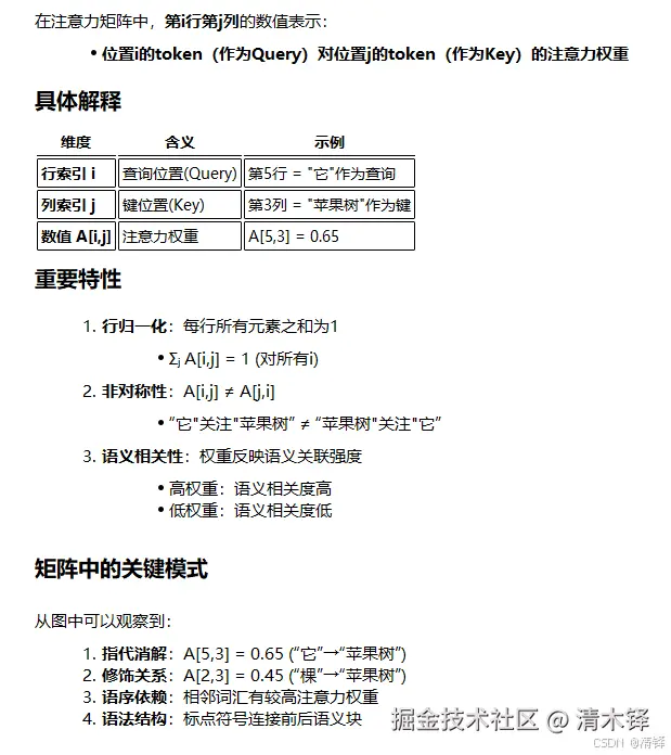 在注意力矩阵中,第i行第j列数值表示,位置i的token作为query对位置j的token(作为key)的注意力权重。高权重代表语义相关度高,反之。